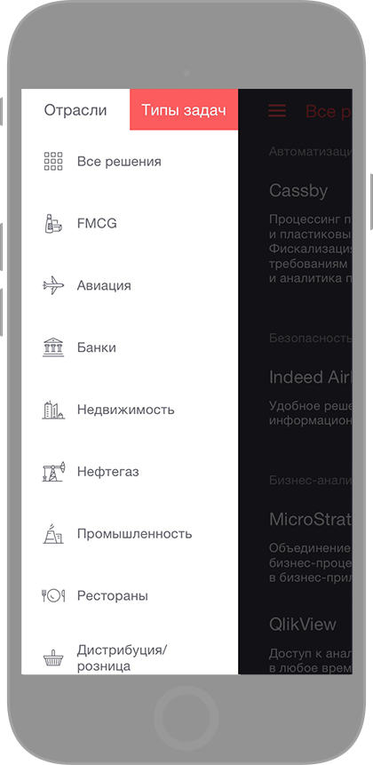 Решения можно сортировать по отраслям или типу